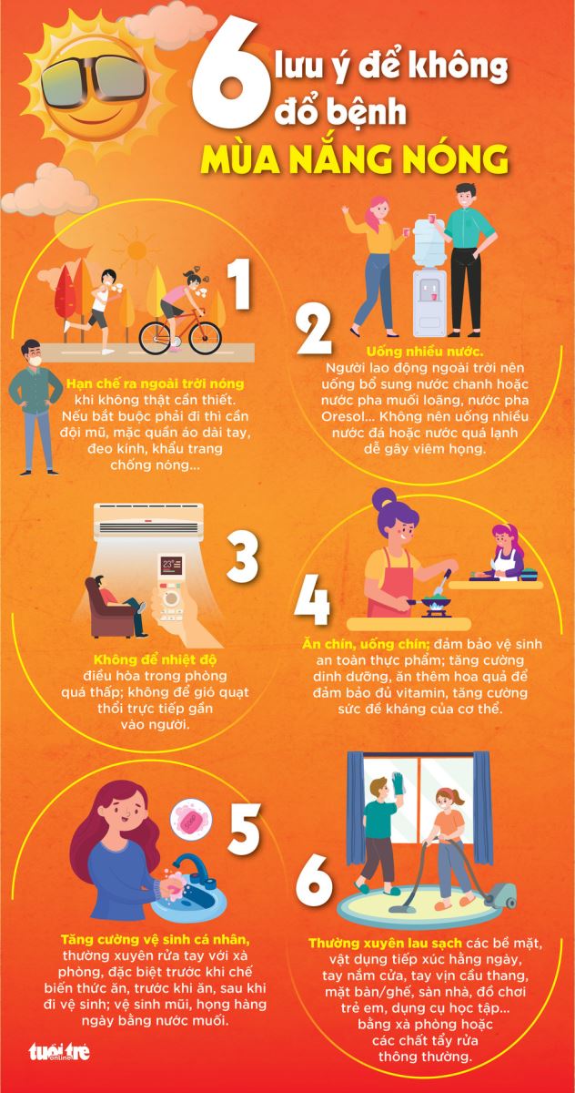 1. Trong mùa nắng nóng, nên cho trẻ ở trong nhà thoáng khí, mát mẻ, tránh để cho trẻ hoạt động vui chơi, thể chất ngoài nắng quá lâu. Nếu cần ra ngoài, cho trẻ đội mũ vành rộng, quần áo sáng màu, chất vải nhẹ nhàng. Nếu đi biển, không cho các em tắm vào thời điểm nắng nóng từ 10 sáng, 16 giờ chiều. Khi trẻ rơi vào tình trạng say nắng, cần lập tức đưa trẻ vào vùng râm mát, thông thoáng và tìm cách hạ thân nhiệt cho trẻ như chườm mát băng khăn mát, nới lỏng quần áo, bù nước và các dung dịch điện giải bằng đường uống.