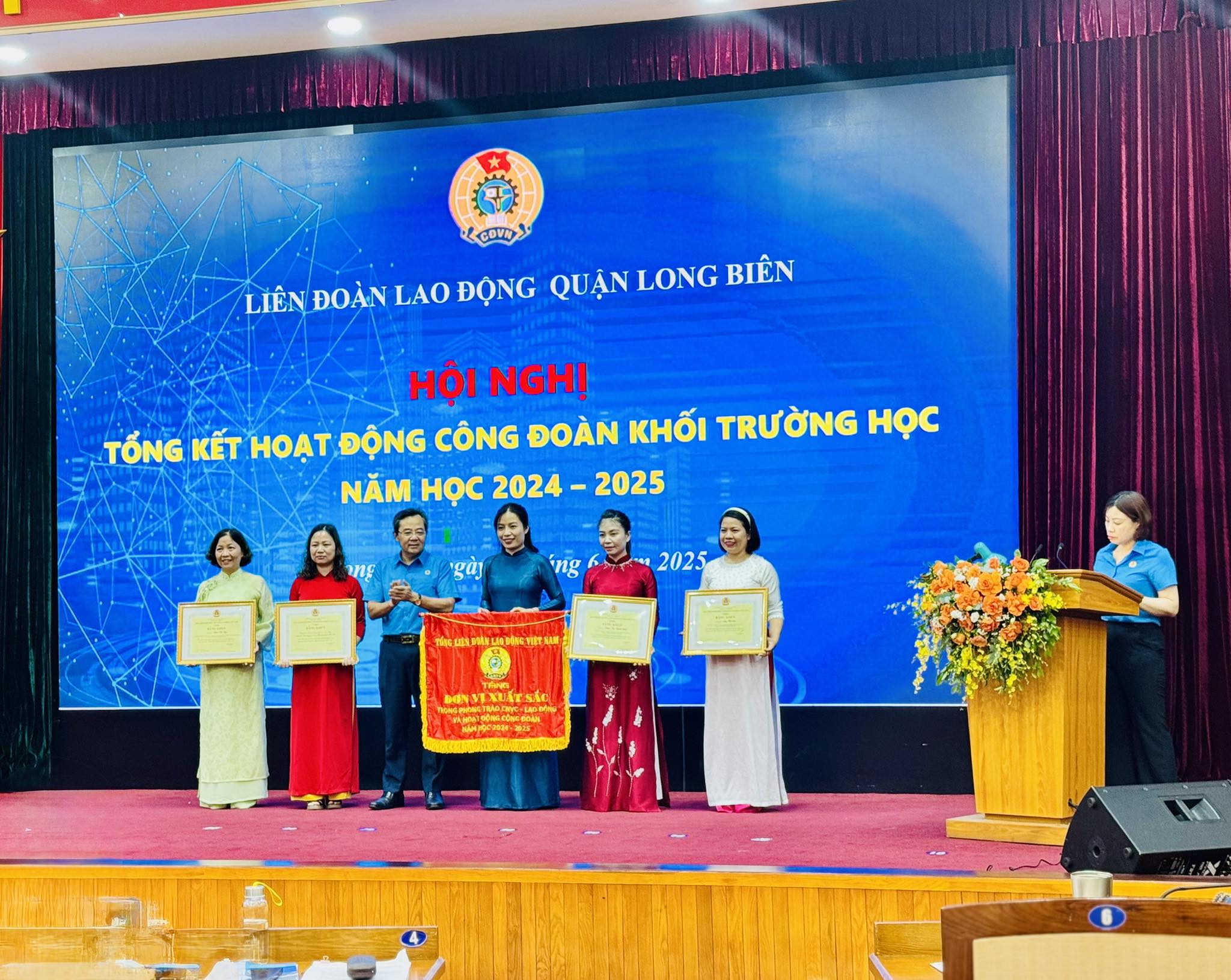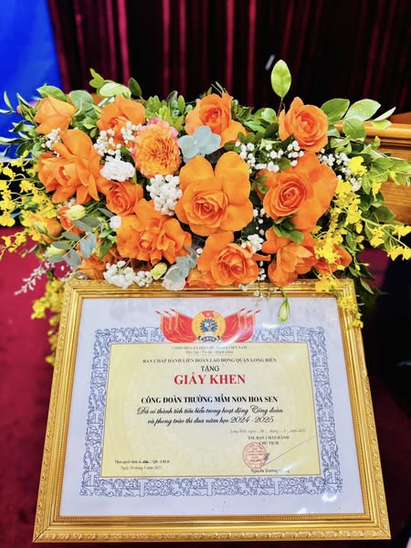 Chiều ngày 11/06/2025, tại Hội nghị tổng kết hoạt động Công đoàn khối trường học năm học 2024-2025, Công đoàn Trường Mầm non Hoa Sen vinh dự được nhận bằng khen “Đã có thành tích tiêu biểu trong hoạt động Công đoàn và phong trào thi đua năm học 2024-2025” do Liên đoàn Lao động quận Long Biên trao tặng. Đây là sự ghi nhận xứng đáng cho những nỗ lực, đoàn kết và cống hiến không ngừng của tập thể nhà trường trong suốt một năm học qua.