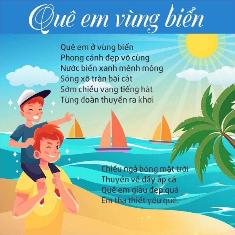 Quê Em Vùng Biển “Quê em ở vùng biển. Phong cảnh đẹp vô cùng. Nước biển xanh mênh mông. Sóng xô tràn bãi cát. Sớm ngày vang tiếng hát. Từng đoàn thuyền ra khơi. Chiều ngả bóng mặt trời. Thuyền về đầy ắp cá. Quê em giàu đẹp quá! Em tha thiết yêu quê.”