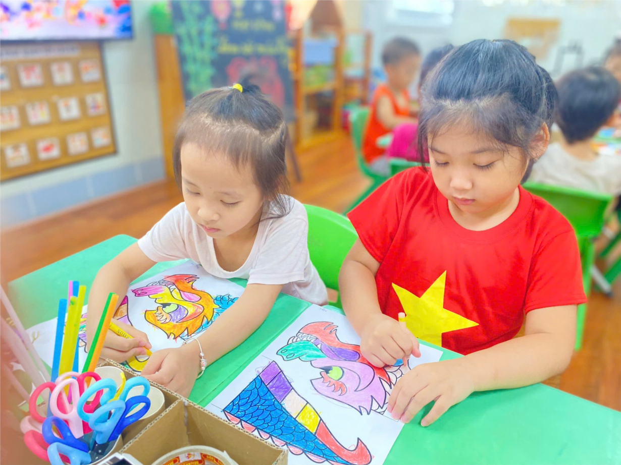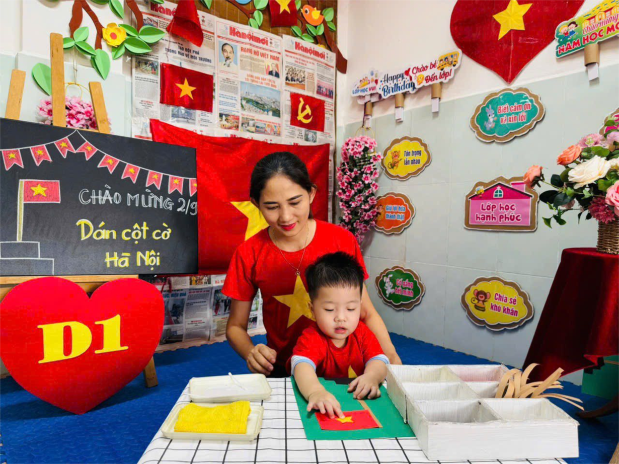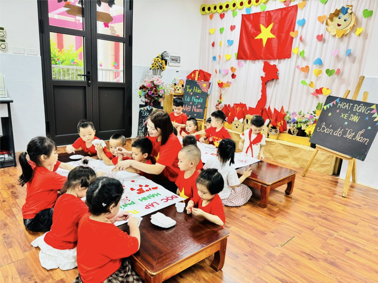 Ảnh đẹp tháng 8/2025- Các bé lớp C1 dán cờ Tổ quốc mừng quốc khánh 2/9