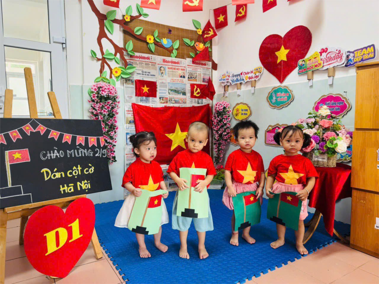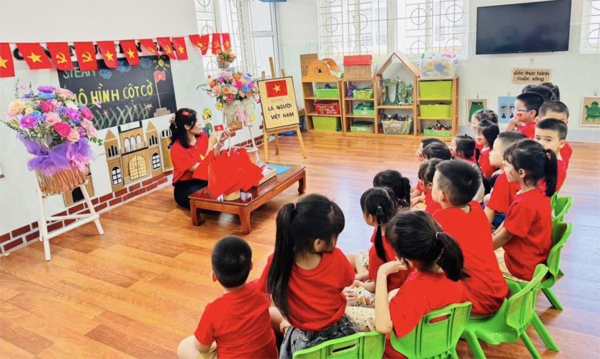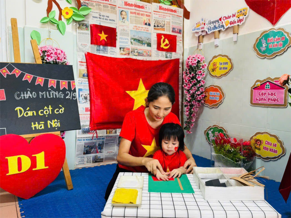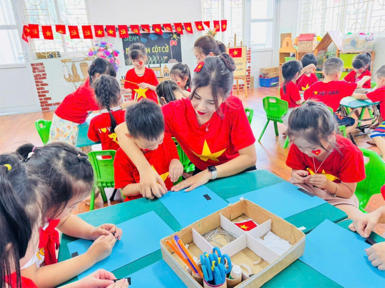Ảnh đẹp tháng 8/2025 - Các bé Nhà trẻ hào hứng dán cột cờ Hà Nội