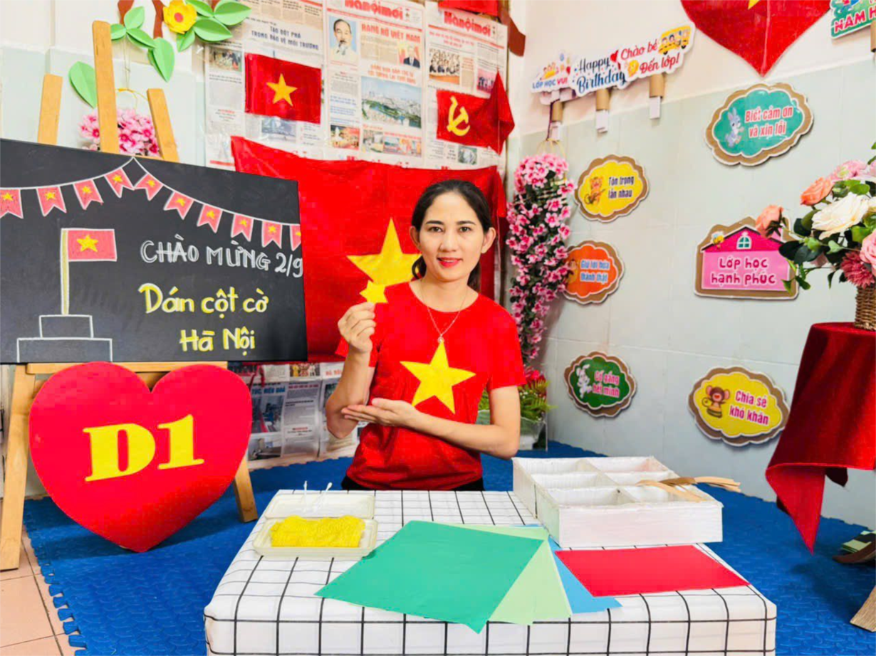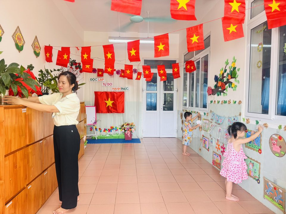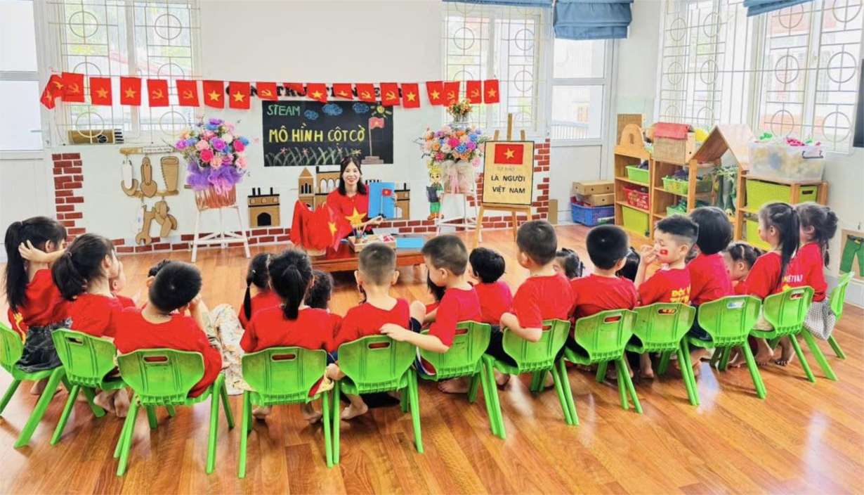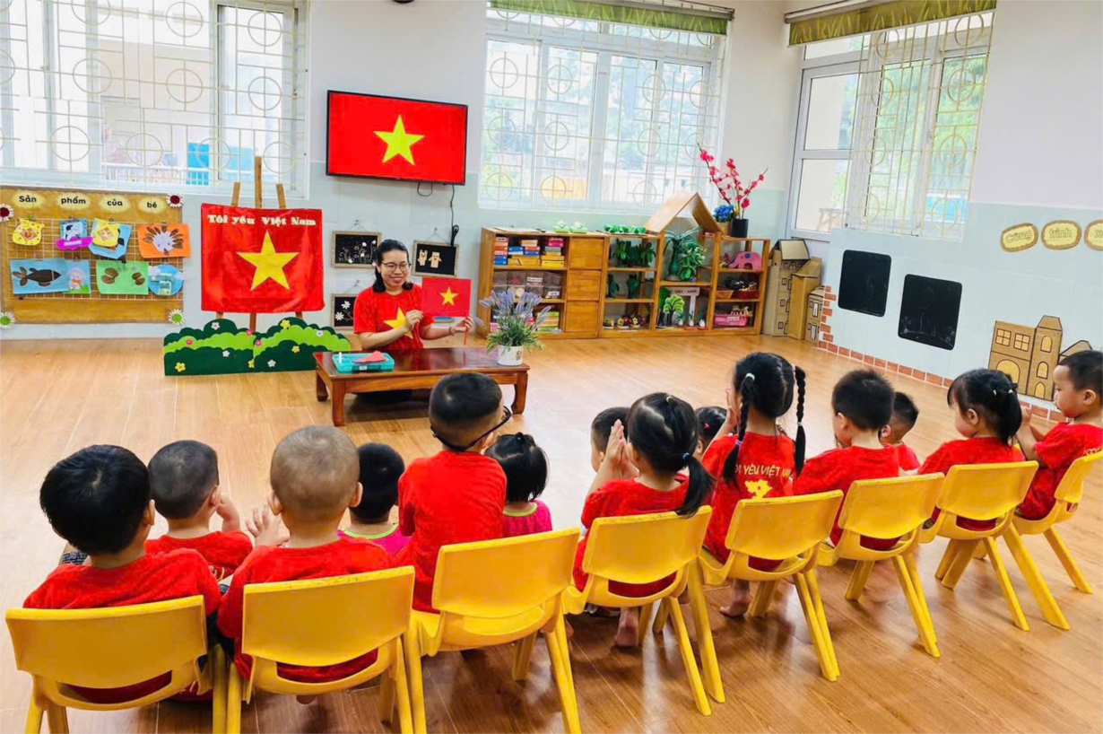 Ảnh đẹp tháng 8/2025 - Các bé Nhà trẻ hào hứng dán cột cờ Hà Nội