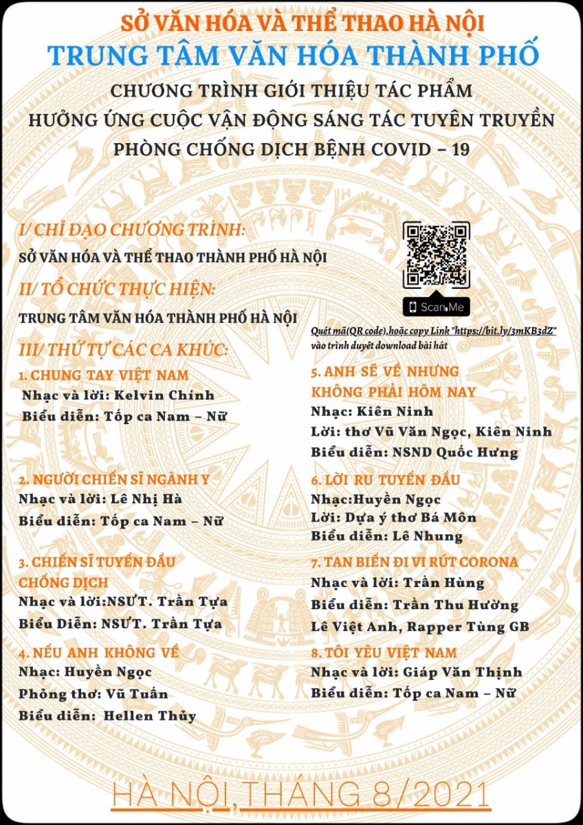 Căn cứ Thông báo số 146/TB-TTVHTP ngày 01/9/2021 của Trung tâm Văn hoá Thành phố Hà Nội về việc giới thiệu các tác phẩm phục vụ công tác tuyên truyền phòng chống dịch bệnh Covid-19.