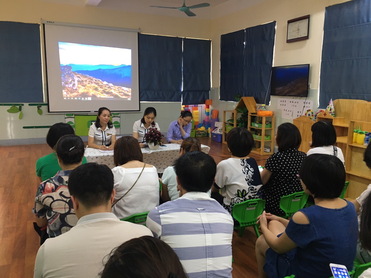 Tiếp đến, các lớp đồng loạt tổ chức họp phụ huynh tại lớp vào hồi 17h30. Tại cuộc họp, các bậc phụ huynh đã được nghe những thành tích mà nhà trường đã đạt được trong năm học 2019 - 2020, kết quả thực hiện nhiệm vụ chăm sóc giáo dục trẻ, kế hoạch tổ chức tổng kết năm học, kế hoạch học hè, kế hoạch tuyển sinh cho năm học mới của nhà trường. Các bậc phụ huynh cũng đã được Ban đại diện cha mẹ học sinh thông qua các khoản thu chi quỹ hội trong năm học. Bên cạnh đó, các bậc phụ huynh dự họp cũng đã dành những lời khen ngợi, động viên những thành quả mà cô và trò trường MN Hoa Sen đã đạt được trong năm học vừa qua.