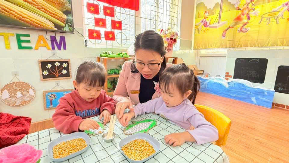 Bằng đôi bàn tay bé xíu, từng hạt ngô vàng óng được các bé tỉ mỉ gắn lên bắp, vừa rèn luyện đôi tay khéo léo, vừa giúp trẻ nhận biết hình dạng – màu sắc – chất liệu tự nhiên một cách sinh động.