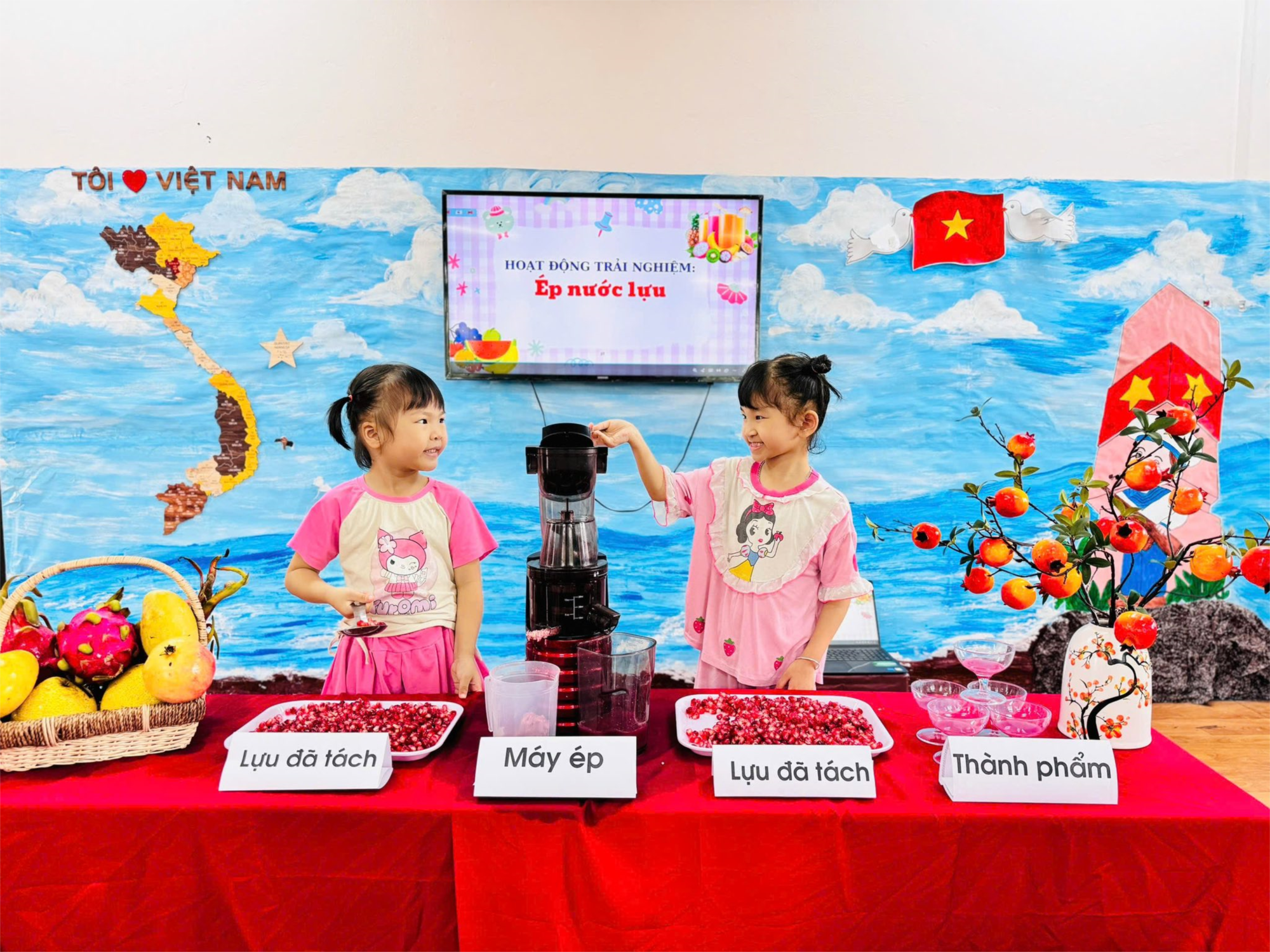 Dưới sự hướng dẫn tận tình của cô giáo, từng hạt lựu đỏ mọng được các bé bóc tách cẩn thận, ép ra thứ nước ngọt ngào, mát lạnh và có màu sắc thật hấp dẫn. Mỗi công đoạn – từ tách hạt, ép nước, đến rót ra ly – đều được các con thực hiện một cách chăm chú, hứng thú và khéo léo.