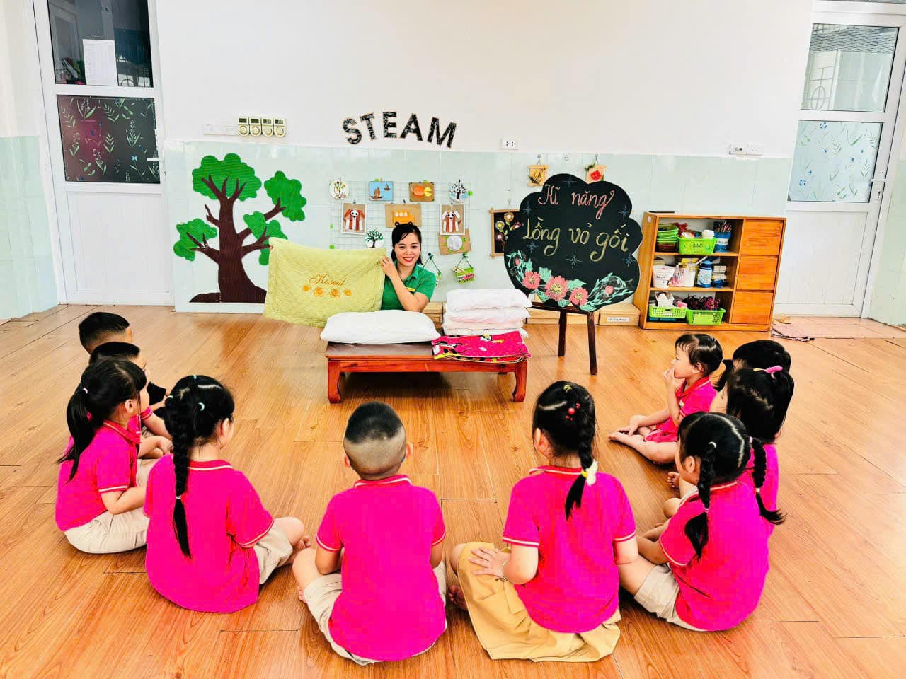Tuần này, các bạn nhỏ lớp Mẫu giáo lớn A1 được cô giáo hướng dẫn kỹ năng lồng vỏ gối.