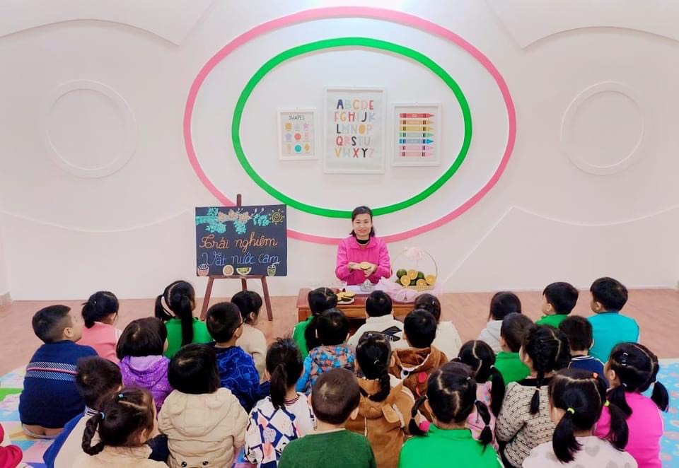 Các bé được cô giáo hướng dẫn cụ thể từng kỹ năng cầm, xoay để vắt cam sao cho ra hết nước trong miếng cam và cùng thưởng thức cốc nước cam thơm ngon bổ dưỡng.