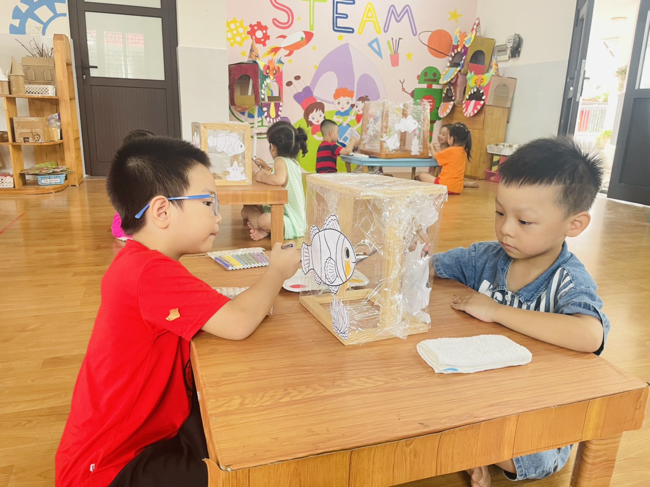 Các bé đã say sưa cùng nhau tô điểm bức tranh đại dương trên mặt nilon, mang đến những hình ảnh sống động và đầy sắc màu.