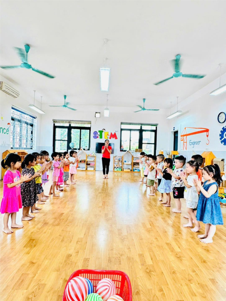 Các bạn nhỏ lớp mẫu giáo nhỡ đã có một giờ học thể chất thật sôi nổi để bắt đầu một ngày hoạt động đầy hứng khởi với đề tài: Bật về phía trước - tung và bắt bóng bằng 2 tay
