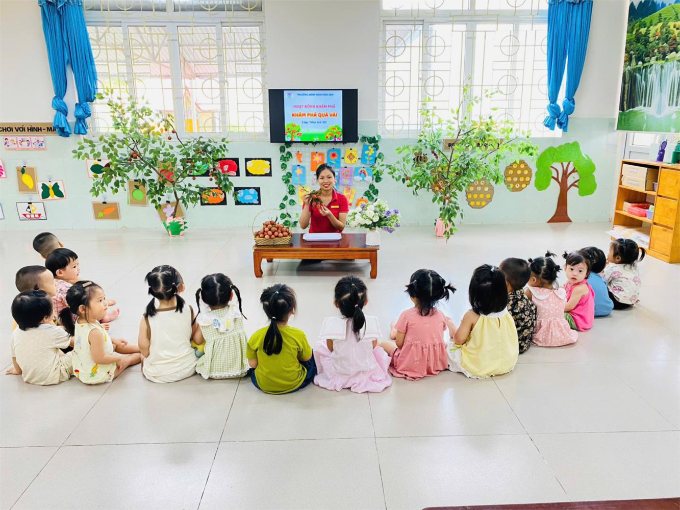 Ngay từ khi cô giáo mang rổ vải vào lớp, ánh mắt trong veo của các bé sáng lên, gương mặt rạng rỡ thích thú khi được tận tay chạm vào những quả vải xinh xắn. Các con được cùng cô sờ lớp vỏ xù xì của quả vải, thử ngửi mùi thơm dịu, rồi hào hứng nếm thử vị ngọt thanh mát lan tỏa nơi đầu lưỡi. Bé còn được trò chuyện cùng cô về hình dáng tròn trịa, về màu đỏ tươi khi vải chín, màu trắng trong khi bóc vỏ, giúp giờ học trở nên sinh động và gần gũi.