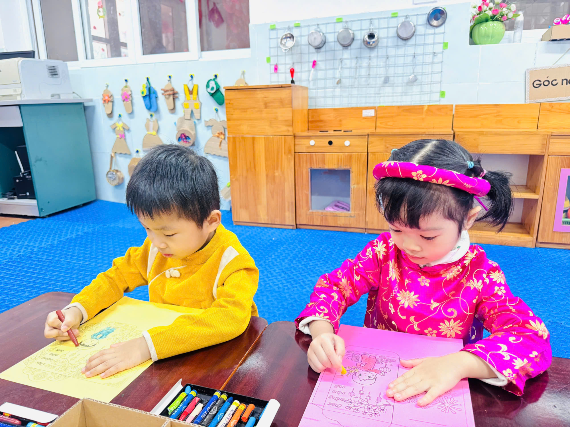 Chiếc bao lì xì – là hình ảnh quen thuộc đối với bé trong ngày Tết cổ truyền. Hôm nay, các con được tự tay tô điểm những gam màu tươi sáng: đỏ, vàng, xanh, hồng cho những chiếc bao lì xì của riêng mình. Mỗi chiếc bao lì xì mang một nét riêng, thể hiện sự sáng tạo và cảm xúc hồn nhiên của mỗi bạn nhỏ, tạo nên bức tranh mùa xuân đầy sắc màu trong lớp học.