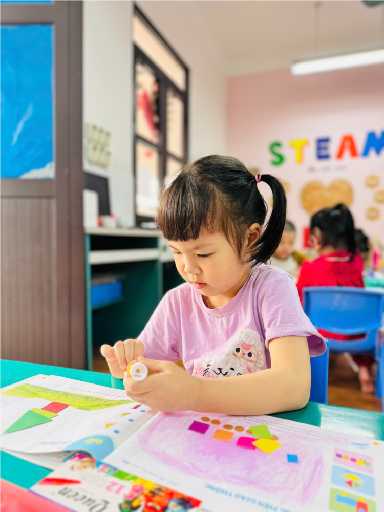 Không chỉ dừng lại ở việc tạo ra sản phẩm, hoạt động còn giúp các bé củng cố kiến thức về hình học cơ bản, nhận biết và phân biệt các loại phương tiện giao thông quen thuộc trong cuộc sống hằng ngày. Đồng thời, thông qua việc lựa chọn, sắp xếp và dán hình, các con còn được rèn luyện sự khéo léo của đôi tay, khả năng quan sát, tư duy logic và tính kiên trì.