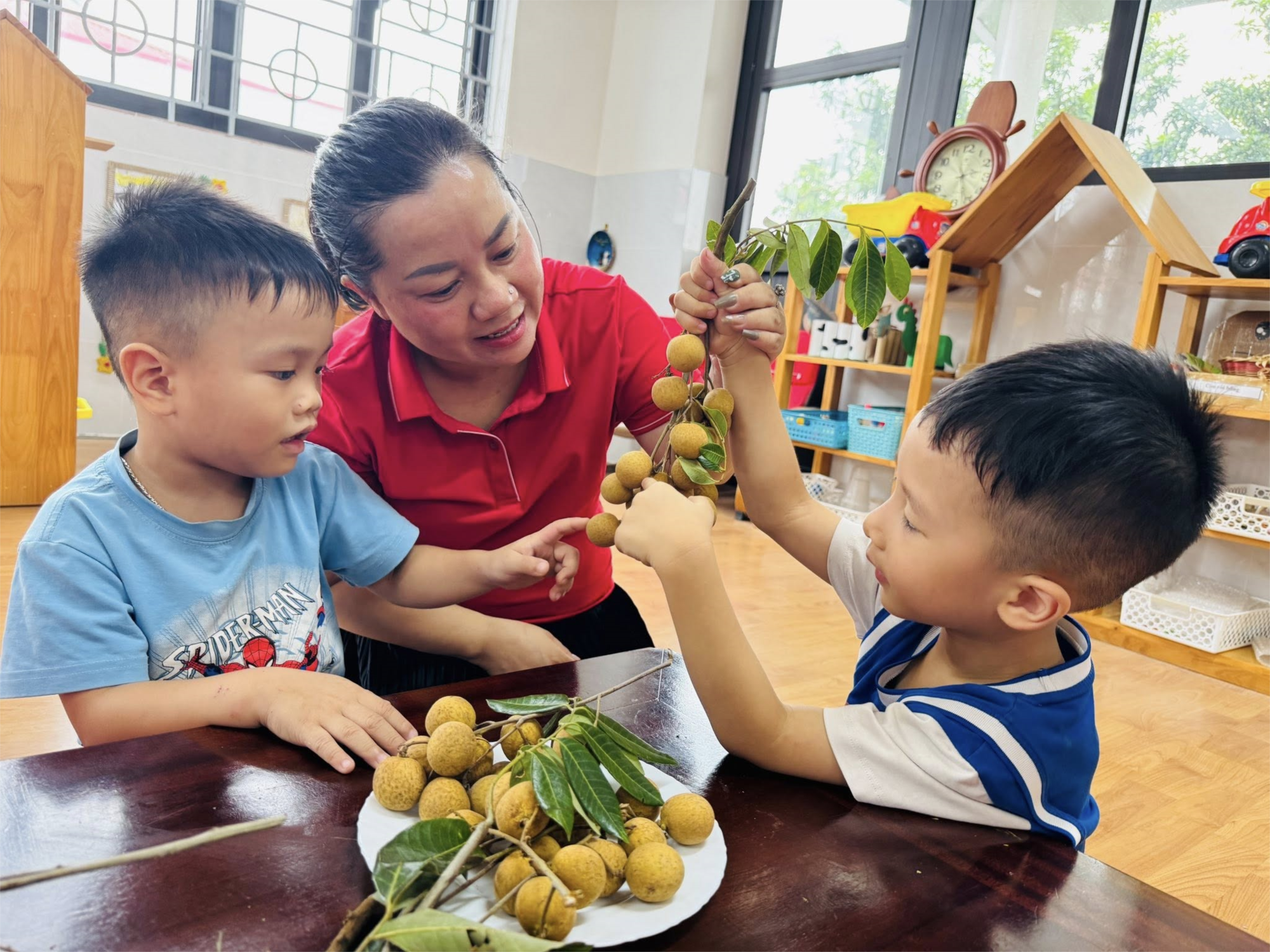 Hôm nay, các bạn nhỏ lớp mẫu giáo nhỡ B2 vô cùng hào hứng khi cùng nhau tham gia hoạt động “Khám phá quả nhãn”. Những chùm nhãn tròn, căng mọng nước được trảy từ vườn trường mang vào lớp như mang theo cả hương vị ngọt ngào của mùa thu miền Bắc.