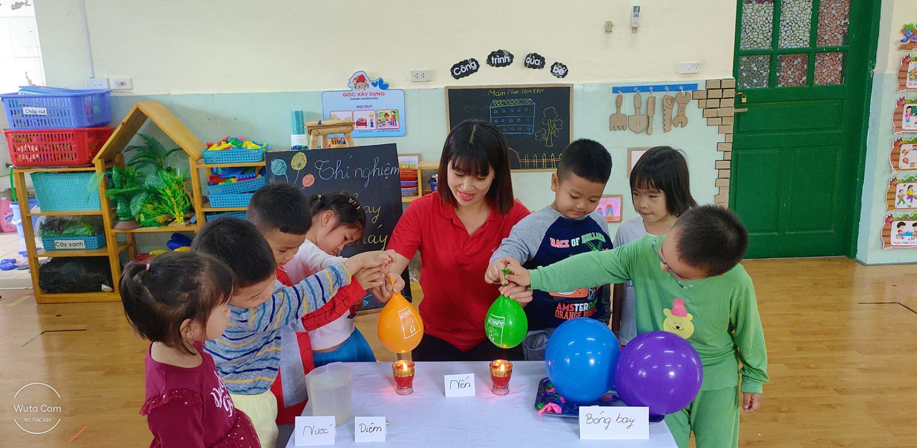 Đó chính là bài học nho nhỏ mà ngày hôm nay các bạn nhỏ lớp Mẫu giáo nhỡ B3 được học. Một thí nghiệm đơn giản mang tên “ BÓNG BAY KHÔNG CHÁY KHI ĐỐT" nhưng qua đó các cô đã truyền tải tới các con một kiến thức hữu ích, đó là: có thể dập tắt lửa bằng nước.