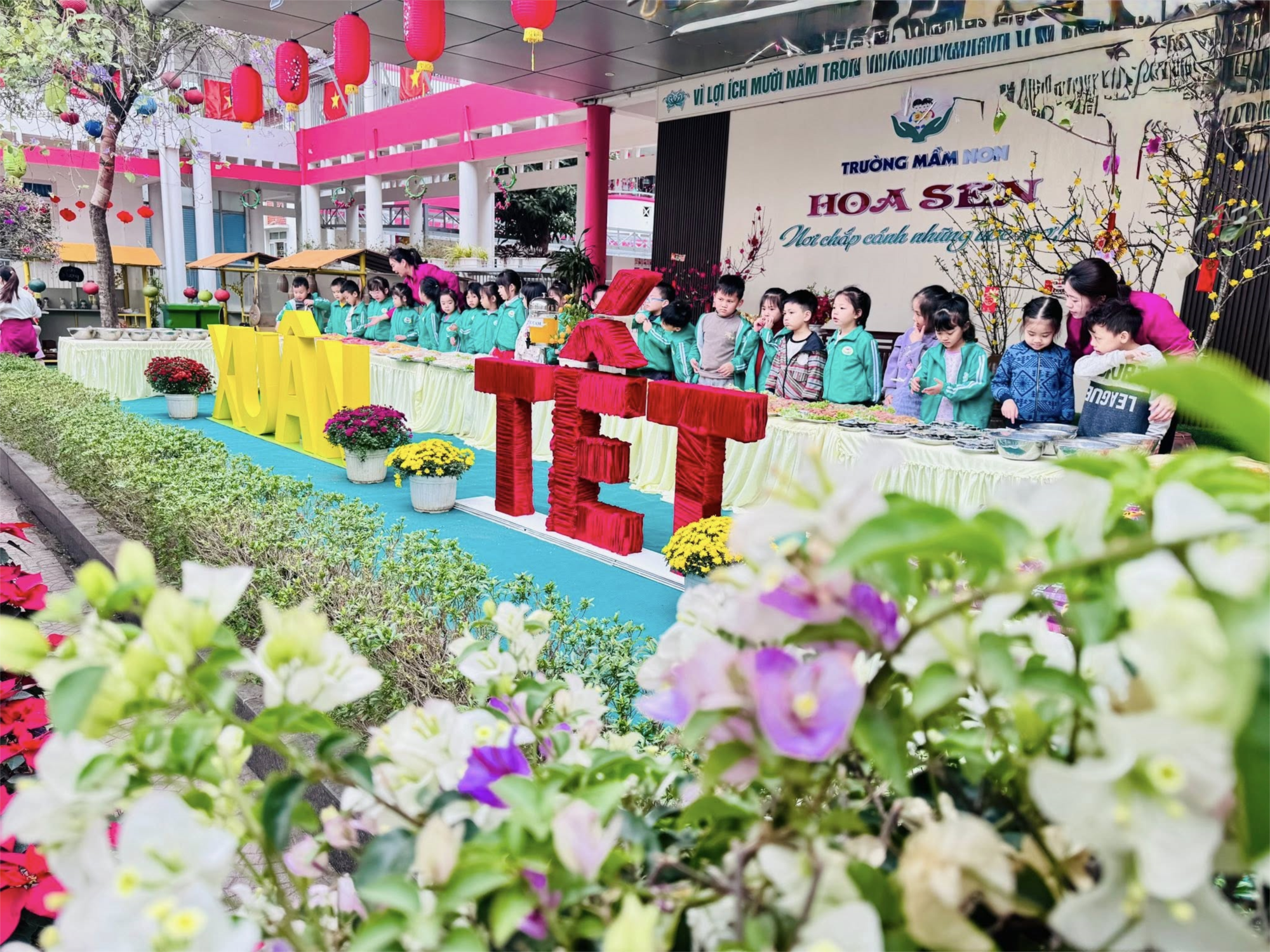 Hòa trong không khí rộn ràng chào đón Tết Nguyên Đán Bính Ngọ 2026, Trường Mầm non Hoa Sen đã tổ chức tiệc Buffet cho các bé với thật nhiều món ăn hấp dẫn, đầy màu sắc và đảm bảo dinh dưỡng 🍱🍊🍰.