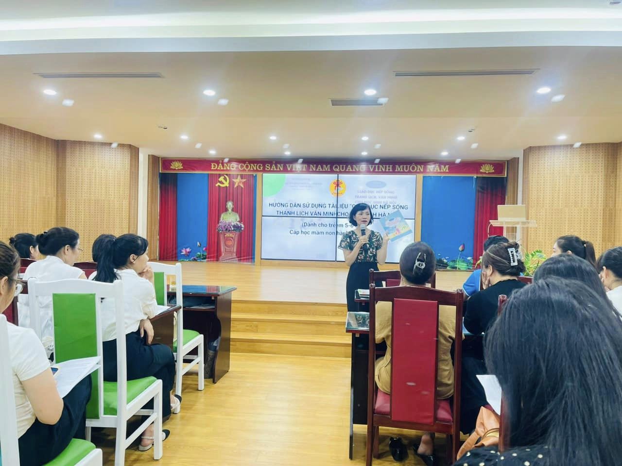 Ngày 24/7/2024, Sở GD&ĐT Hà Nội đã phối hợp với Phòng GD&ĐT Long Biên tổ chức buổi tập huấn “Hướng dẫn sử dụng tài liệu Giáo dục nếp sống thanh lịch văn minh cho học sinh Hà Nội” (Dành cho trẻ em 5-6 tuổi) tại trường MN Đô Thị Sài Đồng.