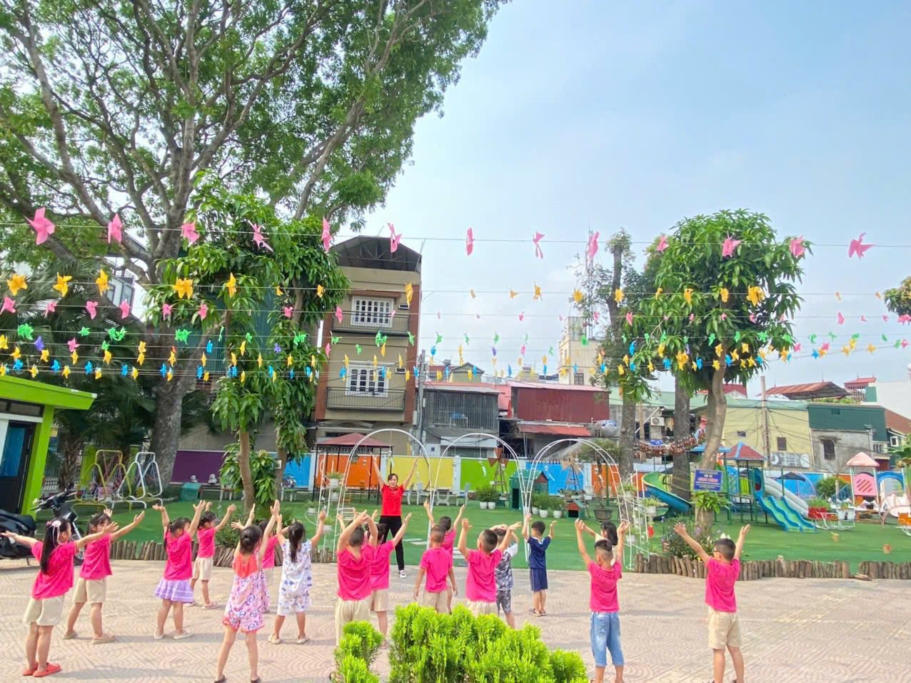 Không gian tập ngoài trời rộng rãi, thoáng mát, không khí trong lành giúp các bé thêm hào hứng, phấn khích, thoải mái khi tham gia vận động.