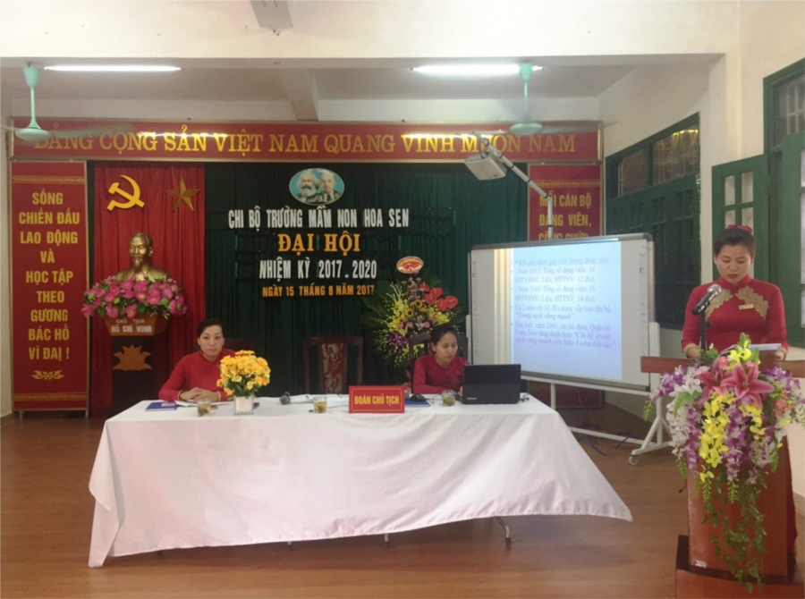 Vào hồi 14h00 chiều ngày 15/8/2017, tại phòng Hội trường của nhà trường đã diễn ra Đại hội chi bộ trường MN Hoa Sen nhiệm kỳ 2017 - 2020. Đến dự và chỉ đạo Đại hội có Đ/c Phan Việt Hưng - Bí thư Đảng ủy phường Đức Giang và Đ/c Vũ Hoàng Long - Phó bí thư thường trực Đảng ủy. Đảng viên tham dự Đại hội gồm có 14 Đ/c đảng viên chính thức, 01 Đ/c đảng viên dự bị của chi bộ và 03 quần chúng ưu tú.