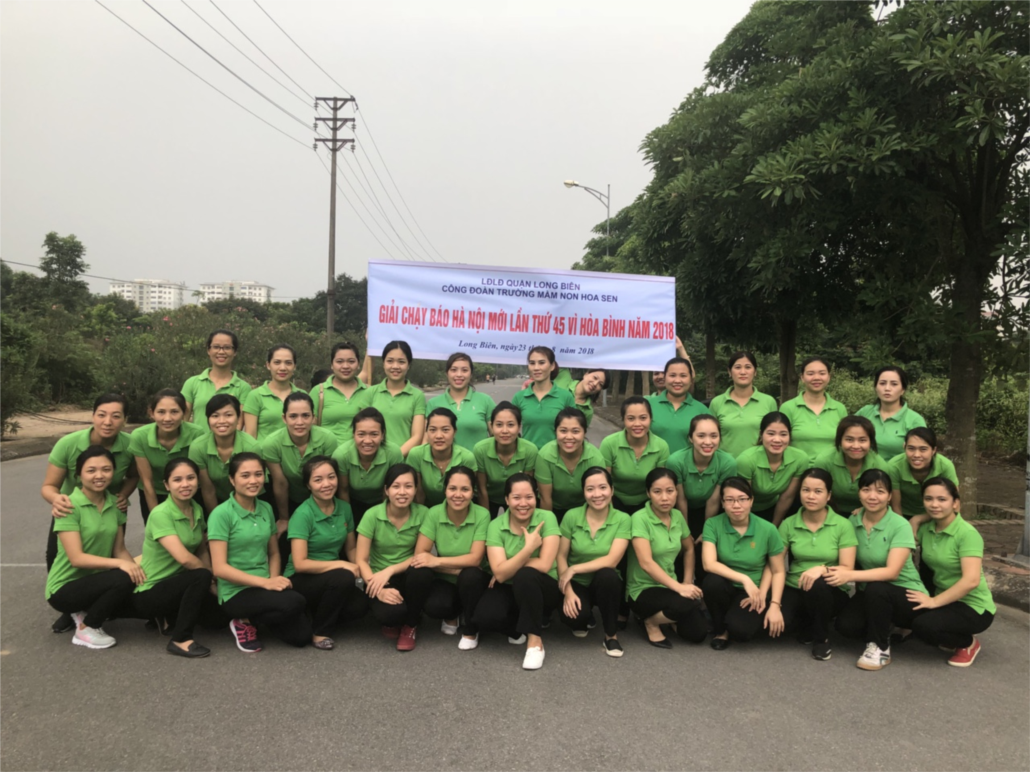 Vào hồi 17h30 chiều ngày 23/8/2018, công đoàn trường MN Hoa Sen đã tổ chức giải chạy Báo Hà Nội mới lần thứ 45 "Vì hòa bình" năm 2018. Giải chạy được diễn ra tại khu đô thị Việt Hưng với sự tham gia của gần 50 nữ đoàn viên công đoàn nhà trường.