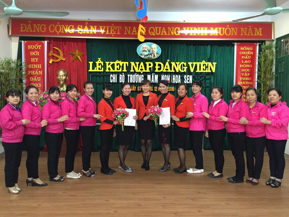 Sáng ngày 7/12/2016, chi bộ trường MN Hoa Sen đã tổ chức Lễ kết nạp đảng viên cho 2 đồng chí: Trương Thị Thanh Huyền và Phạm Thị Liên. Được sự giúp đỡ của chi bộ và sự nỗ lực phấn đấu, rèn luyện của bản thân, 2 đồng chí sau một thời gian được bồi dưỡng, thử thách đã được vinh dự đứng trong hàng ngũ của Đảng Cộng sản Việt Nam.
