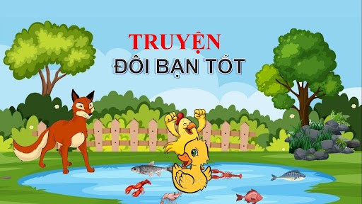 Bỗng …. có 1 con cáo mắt xanh, đuôi dài thấy gà con đang kiếm ăn một mình định nhảy ra vồ. Sợ quá gà con liền ba chân bốn cẳng vừa chạy vừa kêu chiếp .. chiếp .. cứu tôi với . Vịt con đang lặn ngụp dưới ao sâu nghe tiếng bạn gọi liền lướt nhanh vào bờ và cõng bạn ra giữa ao sâu. Thế là gà con thoát chết , từ đó về sau 2 bạn gà - vịt càng yêu mến nhau.