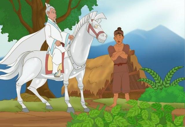 Quả nhiên chiều hôm sau, anh nông dân chờ ở cửa một lát thì thấy một người toàn dát vàng chói lọi, cưỡi một con ngựa cũng màu vàng, dáng điệu bệ vệ, ì ạch đi tới. Người này dừng ngựa trước cửa nhà anh nông dân, nói: